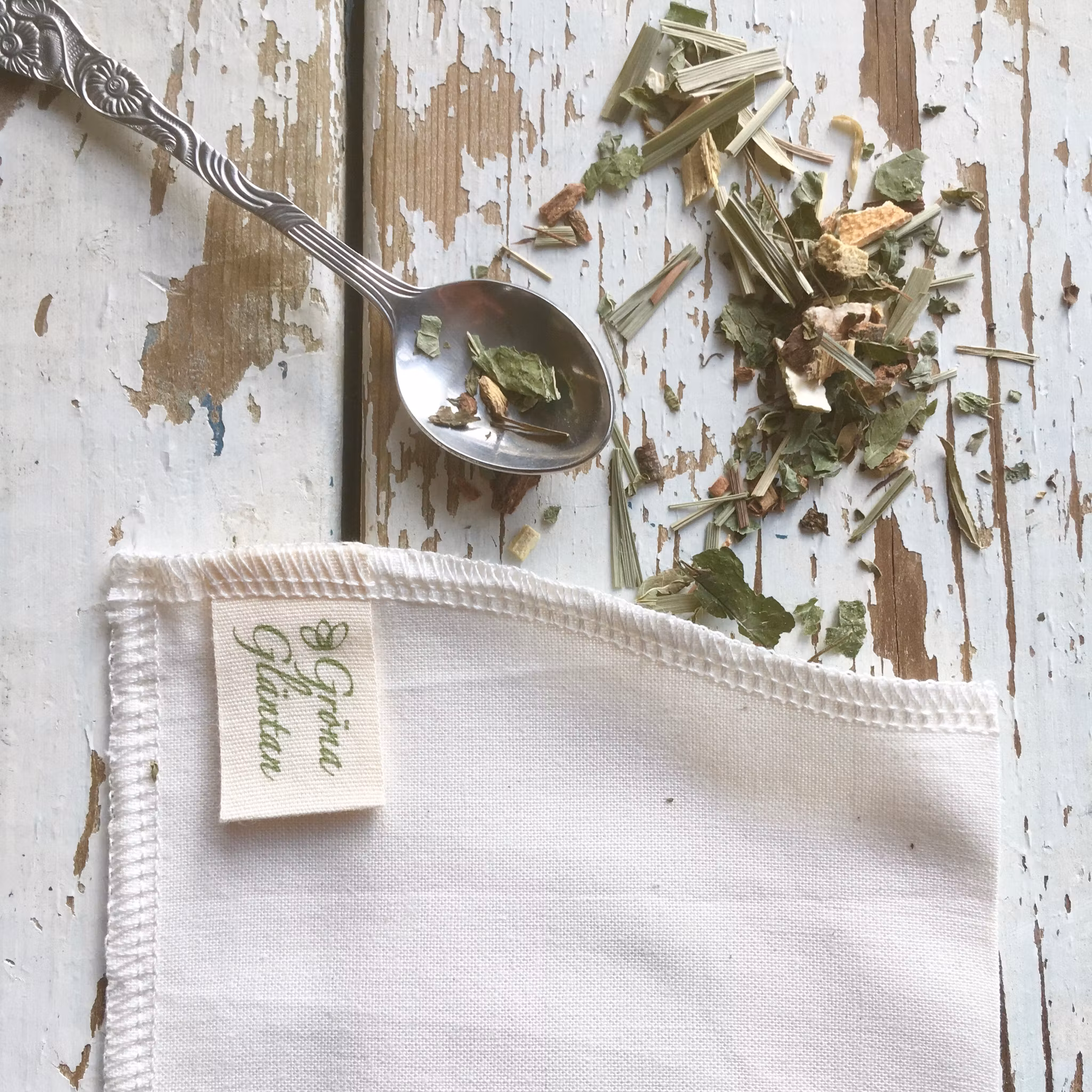 Tefilter i ekologiskt bomullstyg (GOTS-certifierat). 115 kr styck, vid köp av 2 st blir det paketpris 200 kr.Fyll filtret med te, vik det på mitten och lägg hän