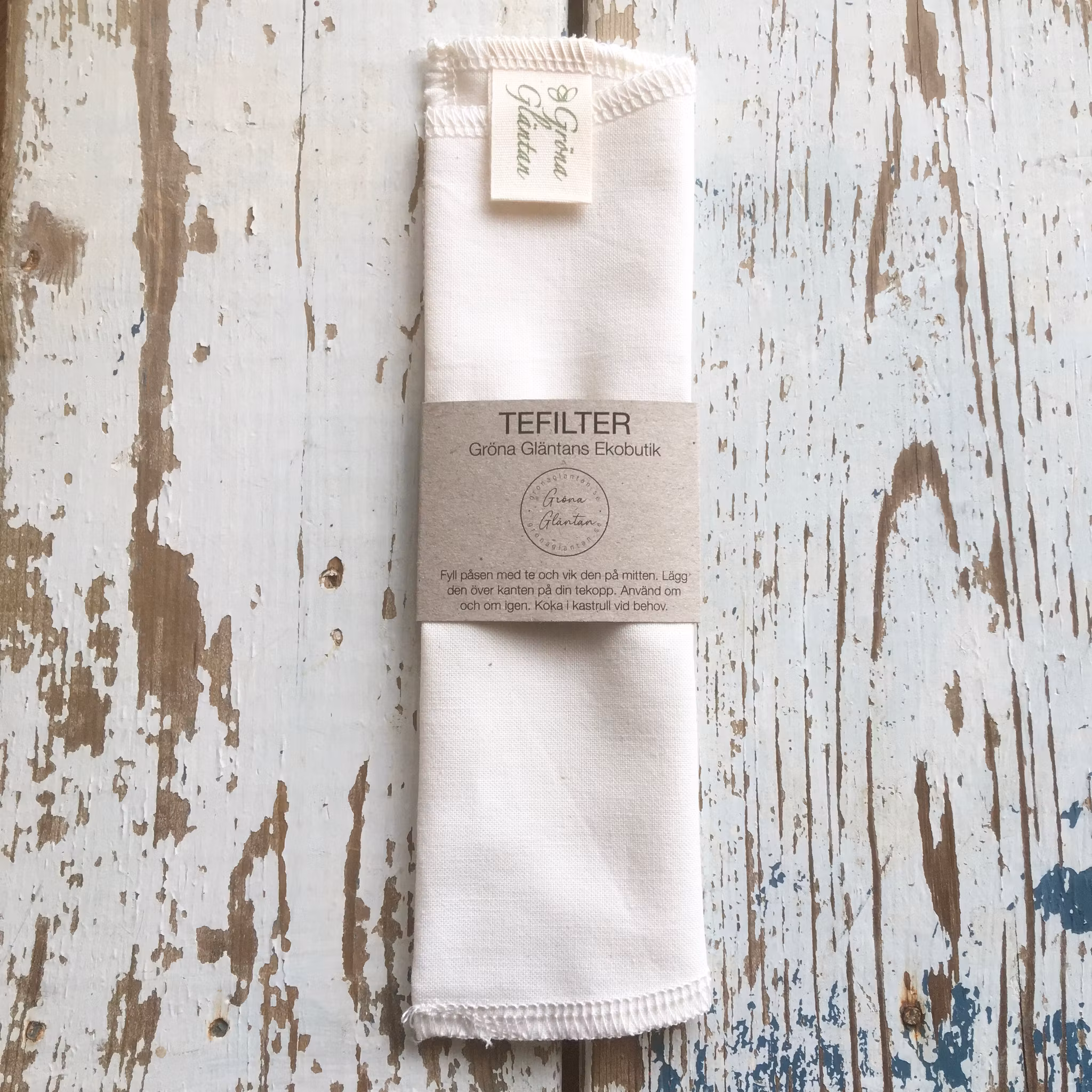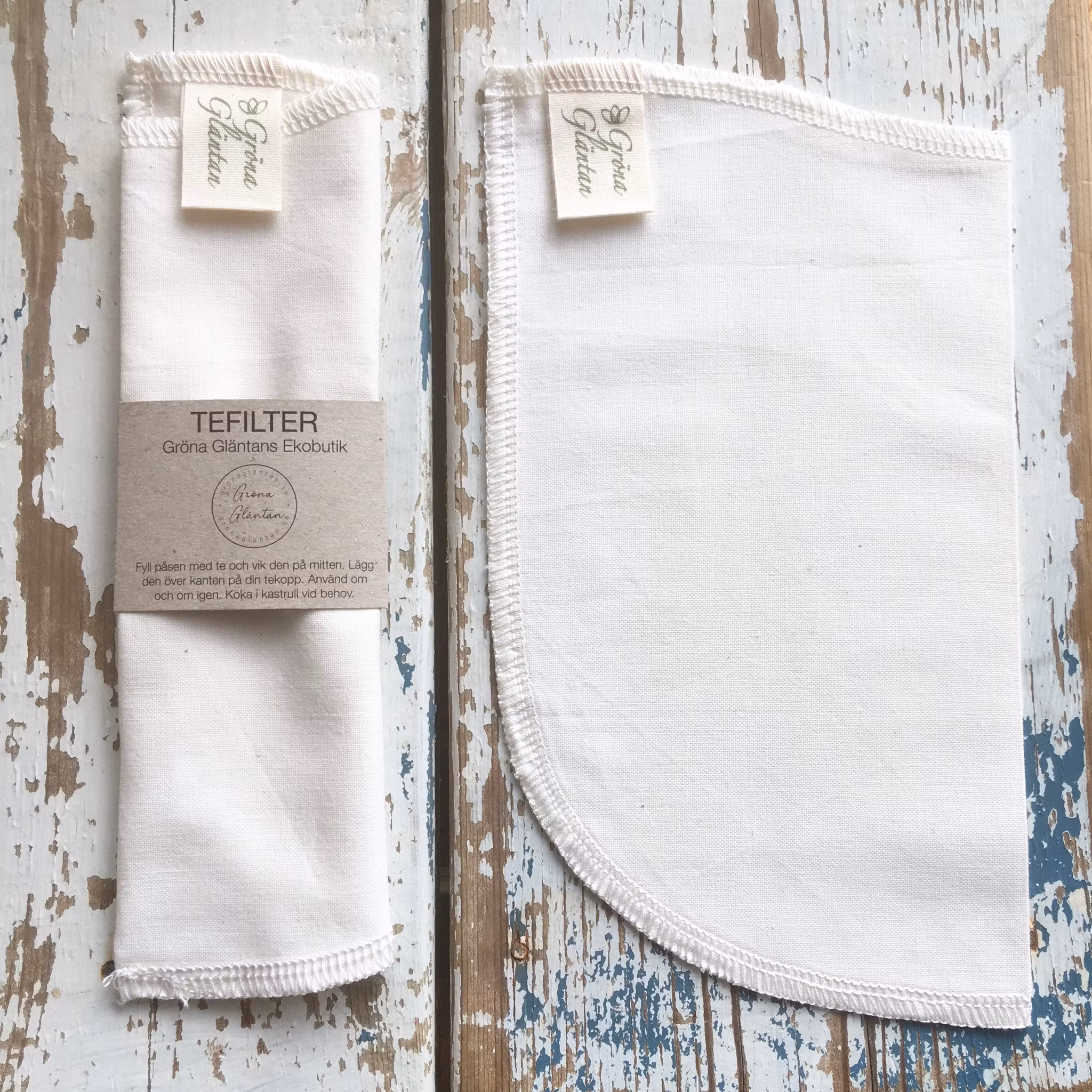 Tefilter i ekologiskt bomullstyg (GOTS-certifierat). 115 kr styck, vid köp av 2 st blir det paketpris 200 kr.